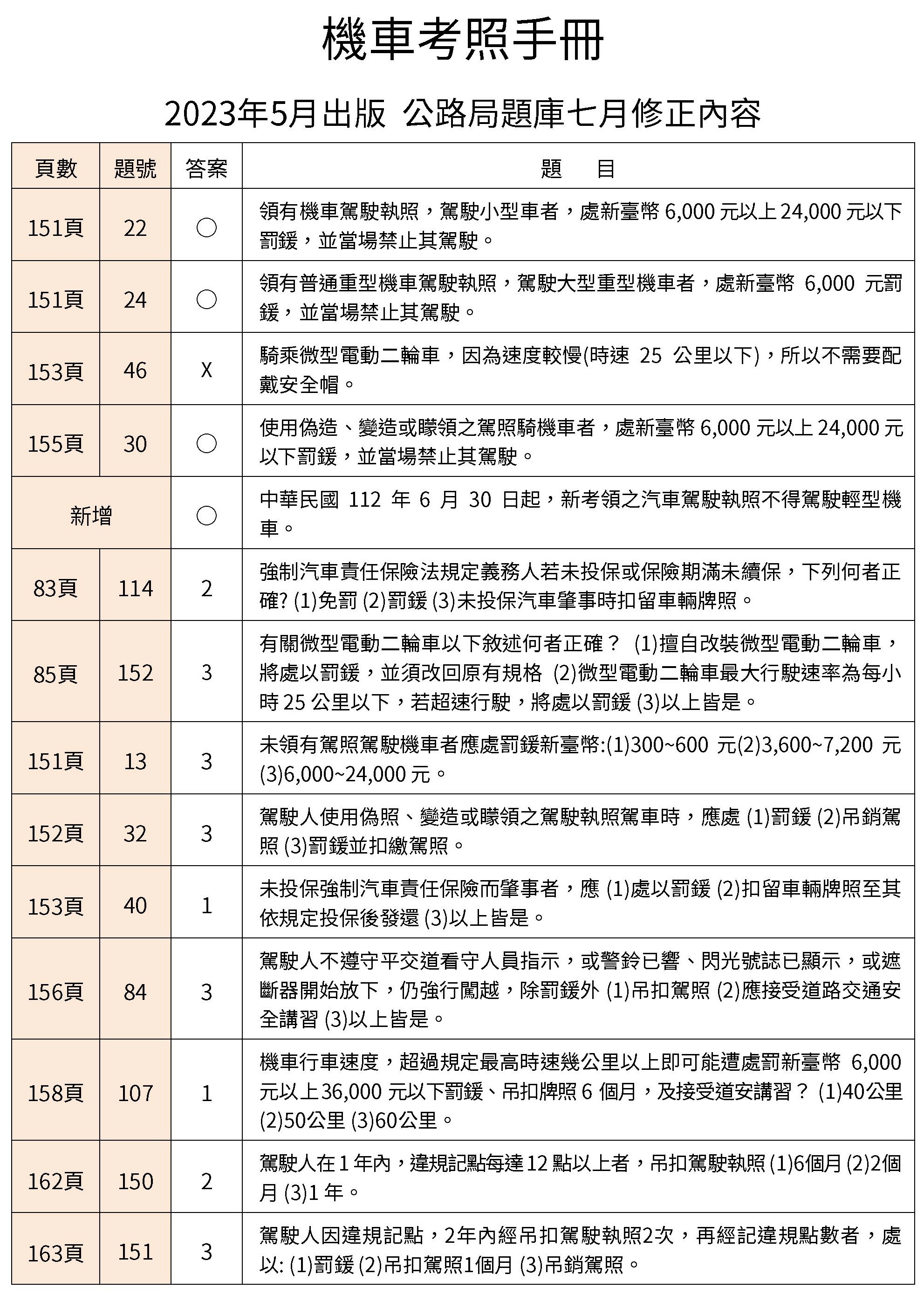 機車考照手冊《2023年5月出版》-公路局題庫七月修正(更新日:2023 年 8 月 24 日)
